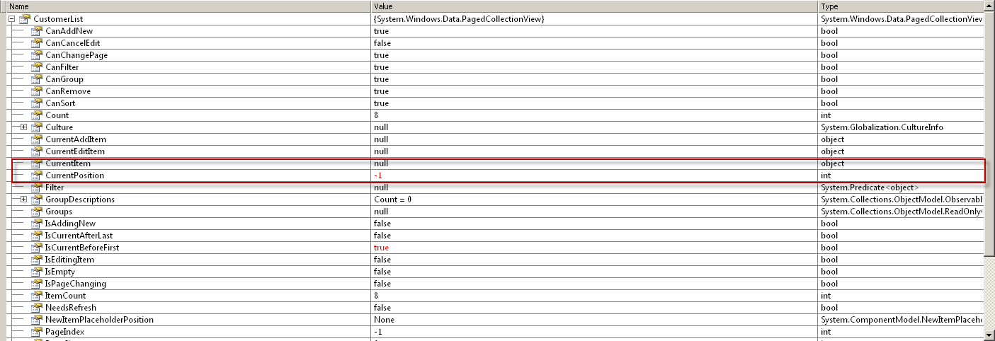 In Image 3 and Image 4 you can see the CurrentItem and CurrentPosition of the CustomerList. Here you can see in the Image 3 that the CurrentItem and CurrentPosition properties are assigned values, mean here you can see CurrentItem has the value of type Customer which is the class I have used to populate the CustomerList of PagedCollectionView type and the CurrentPosition have 0 value mean first row is selected.